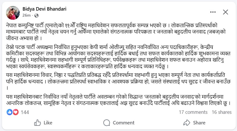 तेस्रो पटक पार्टी अध्यक्षमा निर्वाचित हुनुभएका केपी शर्मा ओलीज्यू सहित नवनिर्वाचित अन्य पदाधिकारीहरू, केन्द्रीय कमिटीका सदस्यहरू तथा विभिन्न आयोगका सदस्यहरूलाई हार्दिक बधाई तथा सफल कार्यकालको हार्दिक शुभकामना व्यक्त गर्दछु । साथै, महाधिवेशनमा सहभागी सम्पूर्ण प्रतिनिधिहरू, पर्यवेक्षकहरू तथा महाधिवेशन सफल बनाउन अहोरात्र खटिनु भएका स्वयंसेवकहरू, स्वास्थ्यकर्मीहरू र कलाकारहरूप्रति हार्दिक धन्यवाद व्यक्त गर्दछु ।