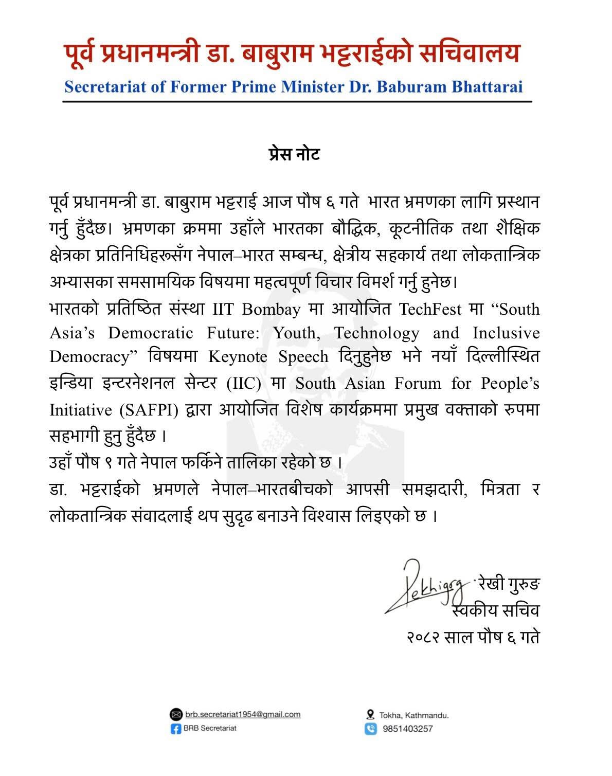 ६ पुस, काठमाडौँ । पूर्व प्रधानमन्त्री डा बाबुराम भट्टराई आजदेखि भारत भ्रमणमा जान लाग्नुभएको छ । दुई फरक कार्यक्रम र अन्य भेटघाटमा सहभागी हुन भट्टराई भारत जान लाग्नुभएको हो ।