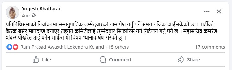 उहाँले भन्नुभएको छ, ‘प्रतिनिधिसभाको निर्वाचनमा समानुपातिक उम्मेदवारको नाम पेश गर्नु पर्ने समय नजिक आईसकेको छ । पार्टीको बैठक बसेर मापदण्ड बनाएर तहगत कमिटीलाई उम्मेदवार सिफारिस गर्न निर्देशन गर्नु पर्ने छ । महासचिव कमरेड शंकर पोखरेललाई फोन मार्फ़त यो विषय ध्यानाकर्षण गरेको छु ।’