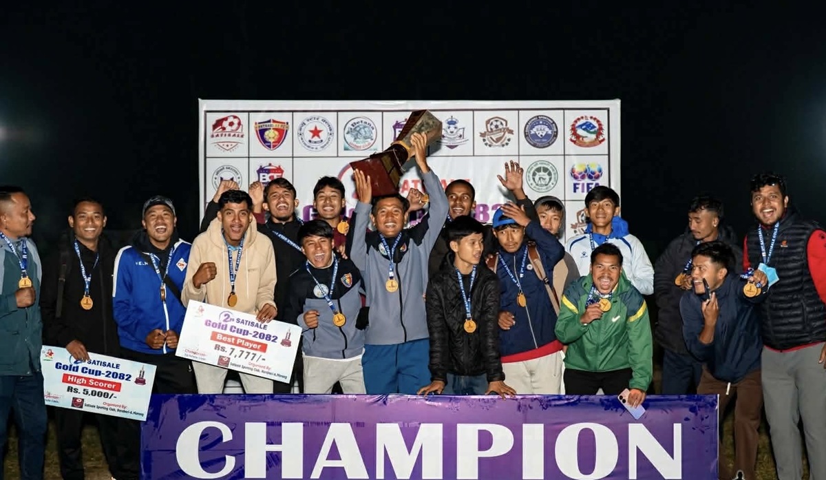 ९ पुस, पथरी (मोरङ) । दोस्रो सतिसाले गोल्डकप खुला नकआउट फुटबल प्रतियोगिताको उपाधि इन्ट्रा पथरी–११ ले चुमेको छ । मङ्गलबार सम्पन्न फाइनल खेलमा इन्ट्रा पथरी–११ ले बेतना युनाइटेड फुटबल क्लब बेलबारीलाई टाइब्रेकरमा २–४ गोलअन्तरले पराजित गर्दै उपाधि चुमेको हो । उपाधिसँगै इन्ट्रा पथरी–११ ले नगद रु दुई लाख दुई हजार २२२ र उपविजेता बेतना युनाइटेडले रु एक लाख एक हजार १११ मा चित्त बुझाउनुपरेको छ ।
