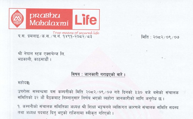 ९ पुस, काठमाडाैँ । अमेरिकी नागरिक शिक्षा भट्टचनले प्रभु महालक्ष्मी लाइफ इन्स्योरेन्सको अध्यक्षबाट राजिनामा दिएकी छन । दैनिकी सहितका सञ्चारमाध्यमले शिक्षा अमेरिकी नागरिक भएर अबैध रूपमा अध्यक्षमा बाहल रहेको समाचार प्रकाशन गरेपछि राजिनामा दिएकी हुन । शिक्षाको राजिनामा पुस ७ गतेको सञ्चालक समिति बैठकले राजीनामा स्वीकृत गरेको हो ।