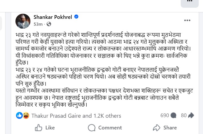 पोखरेलले गत भदौ २३ गते नवयुवाहरूले गरेको शान्तिपूर्ण प्रदर्शनलाई योजनाबद्ध रूपमा मुठभेडमा परिणत गरी केही युवाको हत्या गरिएको टिप्पणी गर्नुभएको छ । भदौ २३ को आडमा भदौ २४ गते मुलुकको अस्मिता र सामर्थ्य कमजोर बनाउने उद्देश्यले राज्य र लोकतन्त्रका आधार स्तम्भमाथि आक्रमण गरिएको भन्दै उहाँले लेख्नुभएको छ, ‘यी विध्वंसकारी गतिविधिका योजनाकार र सञ्चालक को थिए भन्ने कुरा क्रमशस् सार्वजनिक हुँदैछ ।’