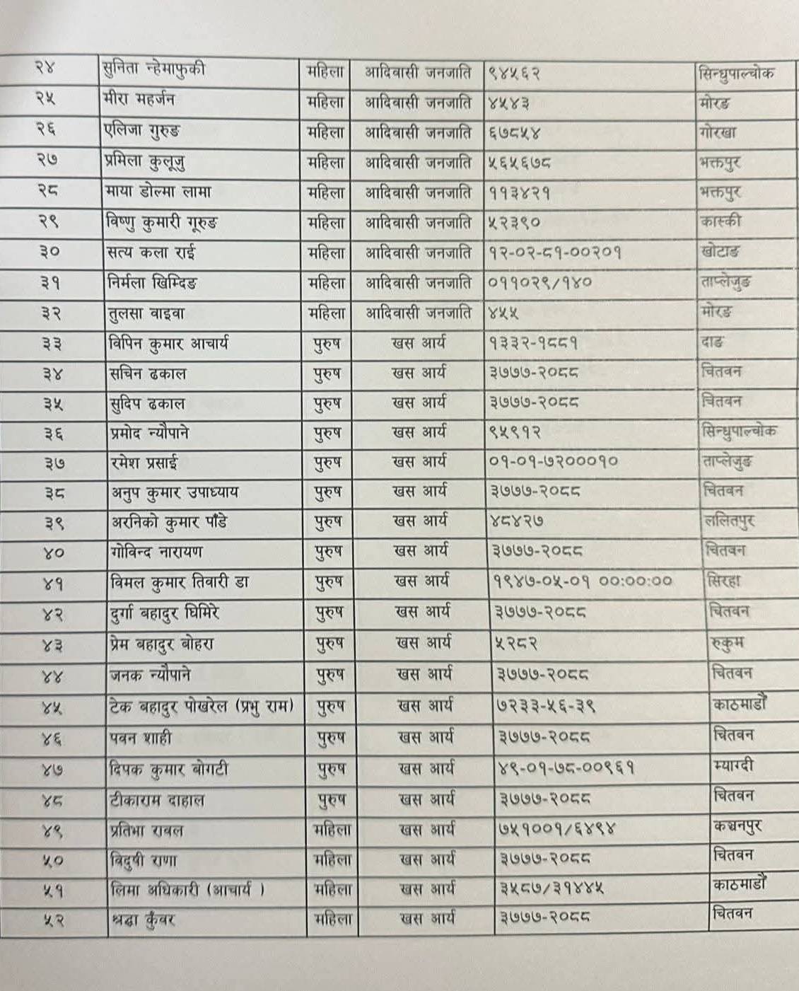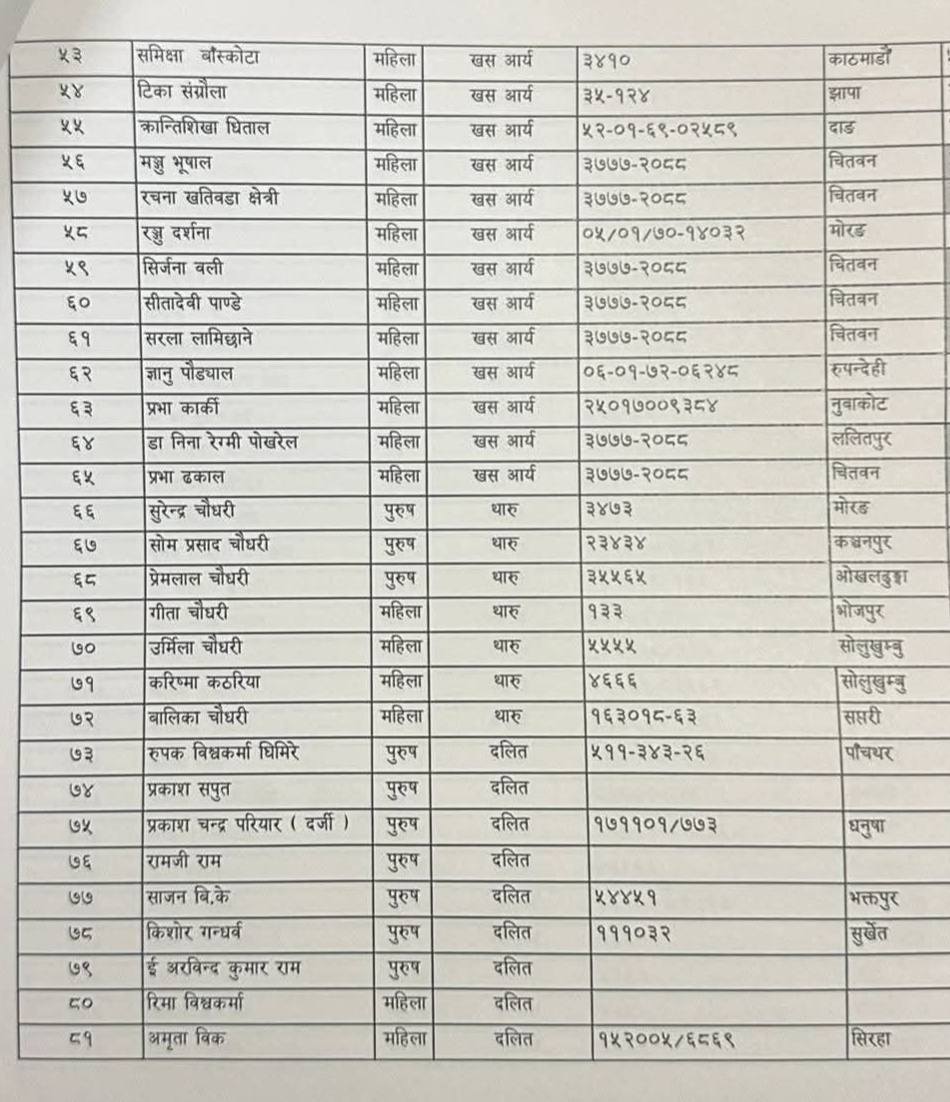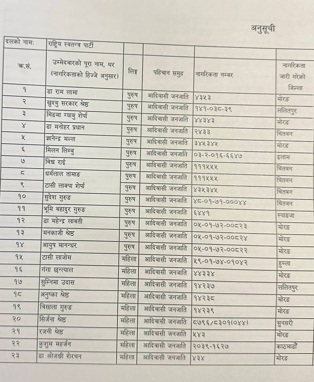 १५ पुस, काठमाडौँ । नुवाकोटको देवकी पौडेल प्रतिनिधिसभा निर्वाचनका लागि समानुपातिक निर्वाचन प्रणालीमा उज्यालो नेपाल पार्टीका तर्फबाट बन्द सूचीमा नाम सिफारिस भएर पनि राष्ट्रिय स्वतन्त्र पार्टीको सूचीमा अटाउन नसेकको पाइएको छ ।