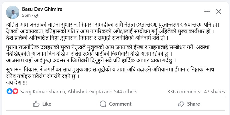 उहाँले अहिले आम जनताको चाहना सुशासन, विकास, समृद्धिका साथै नेतृत्व हस्तान्तरण, पुस्तान्तरण र रुपान्तरण पनि रहेकोमा जोड दिनुभएको छ । उहाँले भन्नुभएको छ, ‘देशको आवश्यकता, इतिहासको गति र आम नागरिकको अपेक्षालाई सम्बोधन गर्नु अहिलेको मुख्य कार्यभार हो । देश प्रतिको अविचलित निष्ठा ,सुशासन, विकास र सम्वृद्वी राजनीतिको अनिवार्य शर्त हो ।’