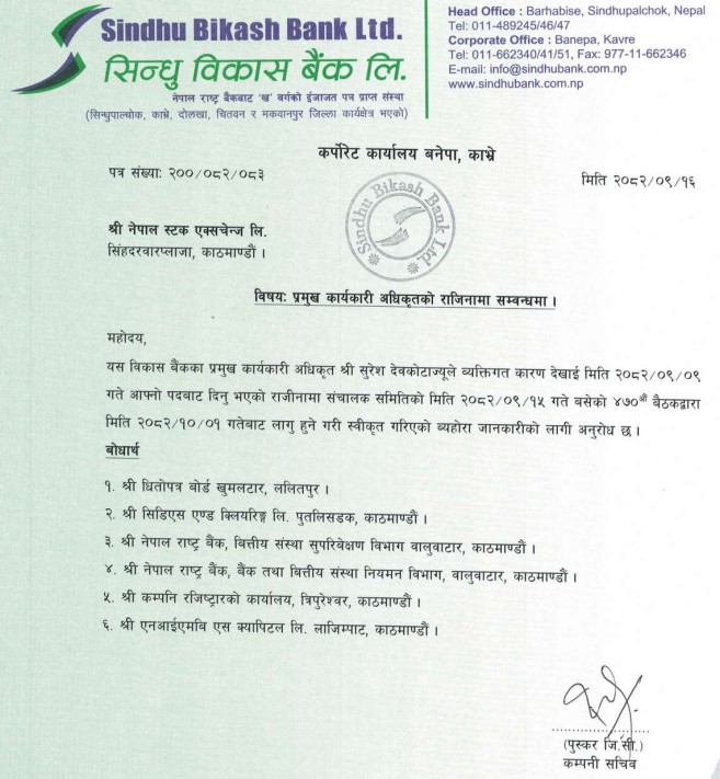 १६ पुस, काठमाडौं ।  सिन्धु विकास बैंक लिमिटेडका प्रमुख कार्यकारी अधिकृत(सीईओ) सुरेश देवकोटाले दिएको राजिनामा स्वीकृत भएको छ । देवकोटाले आफ्नो व्यक्तिगत कारण देखाउँदै गत पुस ९ गते सीईओ पदबाट राजीनामा दिनुभएकाे थियाे।