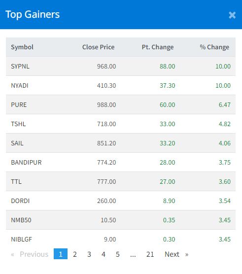आज कारोबार भएका १६३ वटा कम्पनीको सेयरमूल्यमा हरियाली छाएको छ भने ८९ कम्पनीको घटेको छ । ८ कम्पनीको सेयरमूल्य स्थिर रहेको छ । बुधबार एसवाइ प्यानल नेपाल र न्यादी हाइड्रोपावरको सेयरमूल्यमा सकारात्मक सर्किट लागेको छ ।