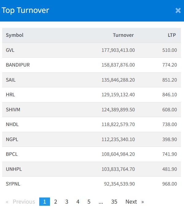 त्यस्तै, यस दिन बन्दीपुर केवलकारको १५ करोड ८८ लाख रुपैयाँ, श्रीनगर एग्रोटेकको १३ करोड ५८ लाख रुपैयाँ, हिमालयन रिइन्स्योरेन्सको १२ करोड ९१ लाख रुपैयाँ र शिवम् सिमेन्टको १२ करोड ४३ लाख रुपैयाँको कारोबार भएको छ ।