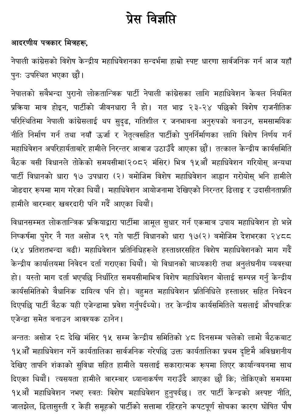 उनीहरूले पूर्वनिर्धारित कार्यतालिका अनुसार नियमित महाधिवेशन हुन नसकेकाले विशेष महाधिवेशनको विकल्प नदेखिएको उनीहरूको तर्क रहेको छ ।  यसअघि महामन्त्रीद्वय गगन थापा र विश्वप्रकाश शर्माले पुस २७ र २८ गते विशेष महाधिवेशन गर्ने गरी हल बुक गरिसकेका छन । यस्तो छ पत्रकार सम्मेलनमा बाँडिएको विज्ञप्ति ।