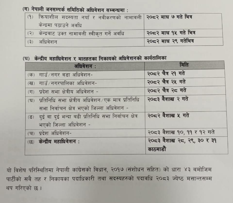 १८ पुस, काठमाडौँ । नेपाली कांग्रेसको महाधिवेशन वैशाखमा हुने भएको छ । पार्टी मुख्यालय विपिनगरमा जारी कार्यसम्पादन समितिको बैठकले वैशाखको अन्तिम साता महाधिवेशन गर्ने प्रस्ताव गरेको छ । बैठकमा २०८३ वैशाख २८ गते देखि ३१ गतेसम्मको मिति प्रस्ताव भएको छ । यस्तो छ प्रस्तावित कार्यतालिका