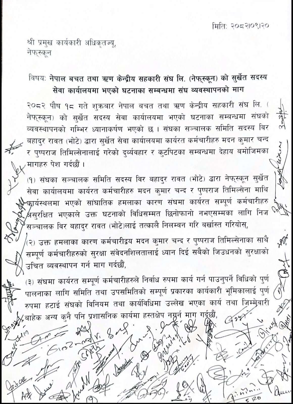‘संघका सञ्चालक समिति सदस्य विर बहादुर रावत (भोटे)द्वारा नेफ्स्कून सुर्खेत सेवा कार्यालयमा कार्यरत कर्मचारीहरु मदन कुमार चन्द र पुष्पराज तिमिल्सेना माथि कार्यस्थलमा भएको सांघातिक हमलाका कारण संघमा कार्यरत सम्पूर्ण कर्मचारीहरु असुरक्षित भएकाले उक्त घटनाको विधिसम्मत छिनोफानो नभएसम्मका लागि निज सञ्चालकरावतलाई तत्कालै निलम्बन गरि बर्खास्त गरियोस्,’ संघले भनेको छ, ‘उक्त हमलाका कारण कर्मचारीद्वय मदन कुमार चन्द र पुष्पराज तिमिल्सेनाका साथै सम्पूर्ण कर्मचारीहरुको सुरक्षा संवेदनशिलतालाई ध्यान दिई सबैको जिउधनको सुरक्षाको उचित व्यवस्थापन गर्न माग गर्दछौं ।’