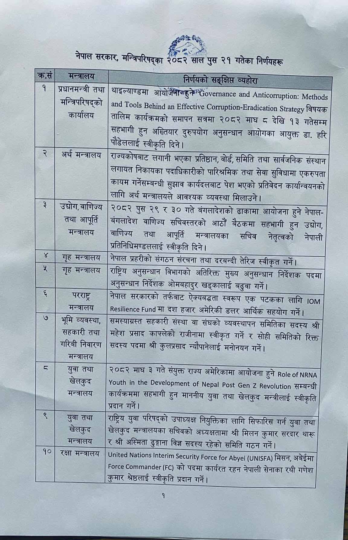 अख्तियार दुरूपयोग अनुसन्धान आयोगका आयुक्त डा हरि पौडेललाई थाइल्याण्डमा आगामी माघ ८ देखि १३ गतेसम्म आयोजना हुने सुशासन र भ्रष्ट्राचार विरुद्धसम्बन्धी तालिममा सहभागी हुन स्वीकृति दिइएको छ । संयुक्त राष्ट्रसङ्घ अन्तरिम सुरक्षा बल (युएनआइएसएफए) मिशन, अवेइमा कार्यरत नेपाली सेनाका रथी गणेशकुमार श्रेष्ठलाई फोर्स कमाण्डर पदमा नियुक्त गर्न स्वीकृति दिइएको छ ।
