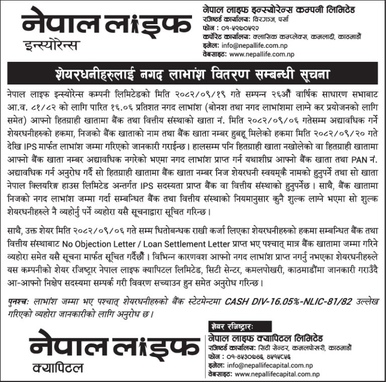 २३ पुस, काठमाडाैं। नेपाल लाइफ इन्स्योरेन्स कम्पनी लिमिटेडले सेयरधनीहरुको खातामा नगद लाभांश जम्मा गरेको छ । कम्पनीले पुस १९ गतेको साधारण सभाबाट पारित भएको १६.०६ प्रतिशत नगद लाभांश(बोनस तथा नगद लाभांशमा लाग्ने कर प्रयोजनका लागि)पुस २० गतेदेखि सेयरधनीहरुको बैंक खातामा जम्मा गरेको हो ।
