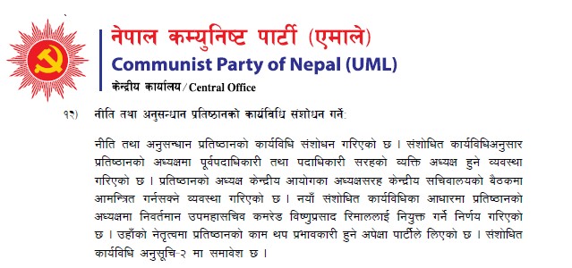 निर्देशनमा भनिएको छ, ‘नीति तथा अनुसन्धान प्रतिष्ठानको कार्यविधि संशोधन गर्नेः नीति तथा अनुसन्धान प्रतिष्ठानको कार्यविधि संशोधन गरिएको छ । संशोधित कार्यविधिअनुसार प्रतिष्ठानको अध्यक्षमा पूर्वपदाधिकारी तथा पदाधिकारी सरहको व्यक्ति अध्यक्ष हुने व्यवस्था गरिएको छ । प्रतिष्ठानको अध्यक्ष केन्द्रीय आयोगका अध्यक्षसरह केन्द्रीय सचिवालयको बैठकमा आमन्त्रित गर्नसक्ने व्यवस्था गरिएको छ । नयाँ संशोधित कार्यविधिका आधारमा प्रतिष्ठानको अध्यक्षमा निवर्तमान उपमहासचिव कमरेड विष्णुप्रसाद रिमाललाई नियुक्त गर्ने निर्णय गरिएको छ ।’