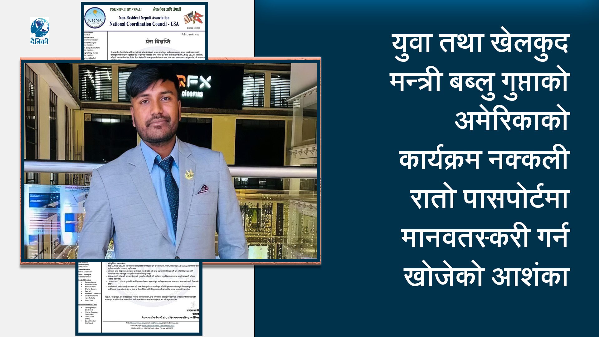 २५ पुस, काठमाडाैँ । युवा तथा खेलकुदमन्त्री बब्लु गुप्तालाई अमेरिकामा कुनै पनि कार्यक्रममा आमन्त्रण नगरेको गैरआवासीय नेपाली संघ, राष्ट्रिय समन्वय परिषद् (एनआरएनए) अमेरिकाले स्पष्ट पारेको छ। योसँगै गुप्ता जान खोजेको अमेरिकाको कार्यक्रम नै नक्कली रहेको पुष्टि भएको छ ।