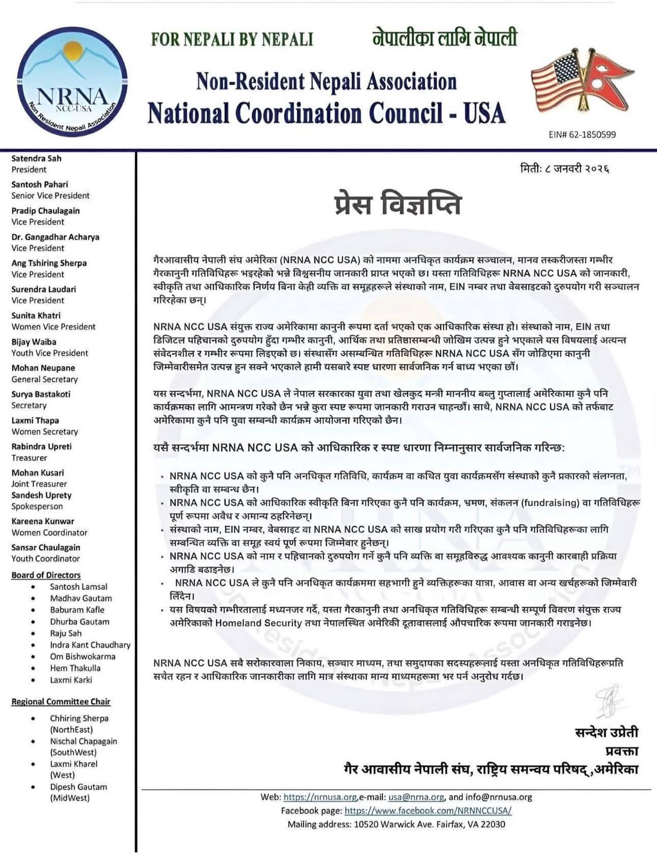 उप्रेतीले एनआरएनए अमेरिकाको आधिकारिक स्वीकृति बिना गरिएका कुनै पनि कार्यक्रम, भ्रमण वा फन्डराइजिङ अवैध हुने उल्लेख गर्नुभएको छ । साथै परिषद्को नाम र पहिचान दुरुपयोग गर्ने व्यक्ति वा समूहविरुद्ध कानुनी कारबाही अघि बढाइने पनि बताउनुभएको छ । गुप्ताले रातो पासपोर्ट प्रयोग गरेर मानवतस्करी गर्न खोजेको भन्दै शंकाहरु पनि उब्जिएका छन । यद्यपी यसमा प्रहरीले अनुसन्धान गर्छ होला नै ।