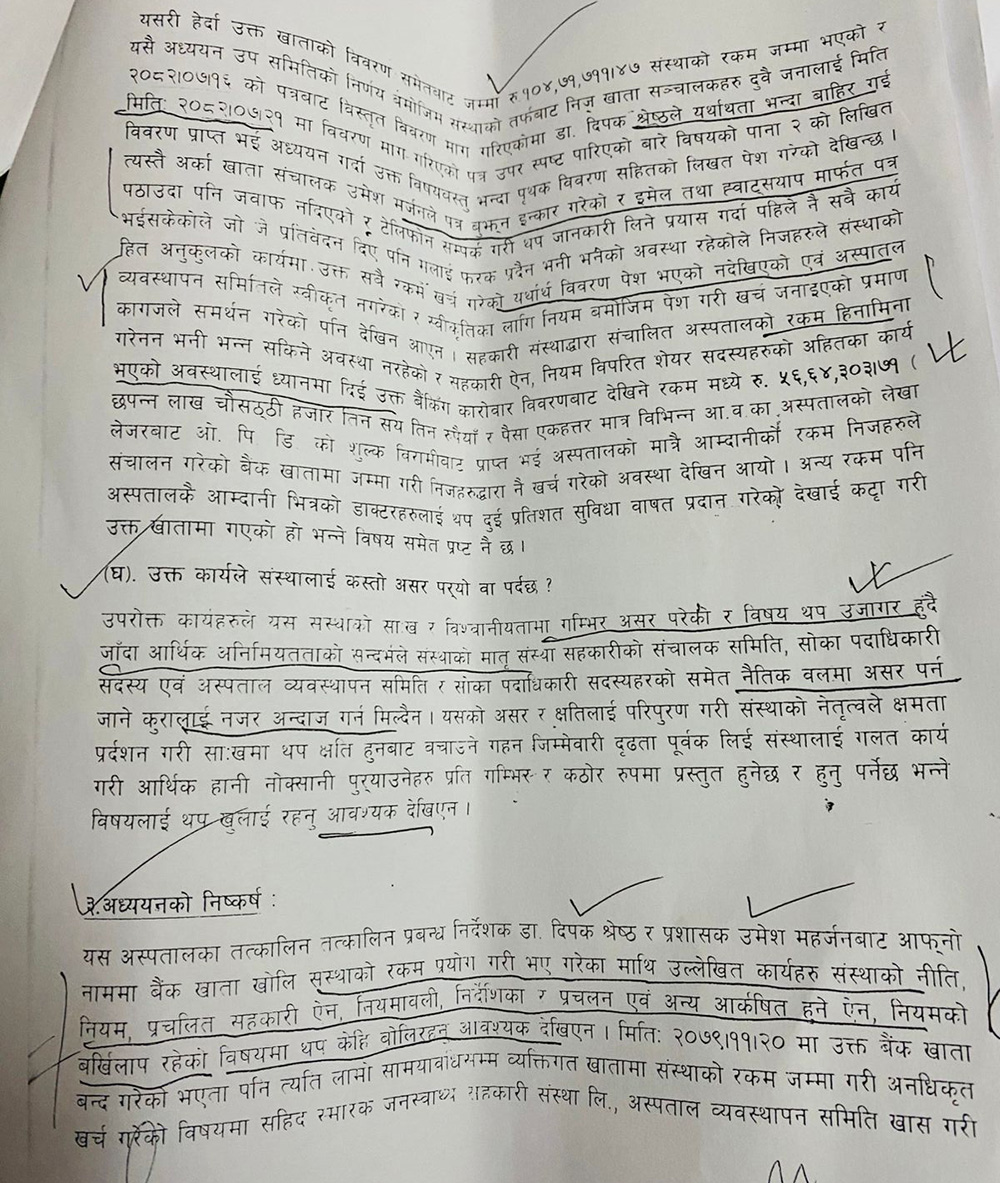 प्रतिवेदनमा भनिएको छ, ‘उपरोक्त कार्यहरूले यस संस्थाको साख र विश्वसनीयतामा गम्भीर असर परेको र विषय थप उजागर हुँदै जाँदा आर्थिक अनियमितताको सन्देशले संस्थाको मात्र संस्था सहकारीको सञ्चालक समिति, सोका पदाधिकारी सदस्य एवं अस्पताल व्यवस्थापन समिति र सोका पदाधिकारी सदस्यहरूको समेत नैतिक बलमा असर पर्ने कुरालाई नजरअन्दाज गर्न मिल्दैन । यसको असर र क्षतिलाई परिपूरण गरी संस्थाको नेतृत्वले क्षमता प्रदर्शन गरी संस्थालाई थप क्षति हुनबाट बचाउने गहन जिम्मेवारी दृढतापूर्वक लिई संस्थालाई गलत कार्य गरी आर्थिक हानि नोक्सानी पुर्याउनेहरू प्रति गम्भीर र कडा रूपमा प्रस्तुत हुनुपर्छ भन्ने विषयलाई थप खुलाउँदै रहन आवश्यक देखिन्छ ।’