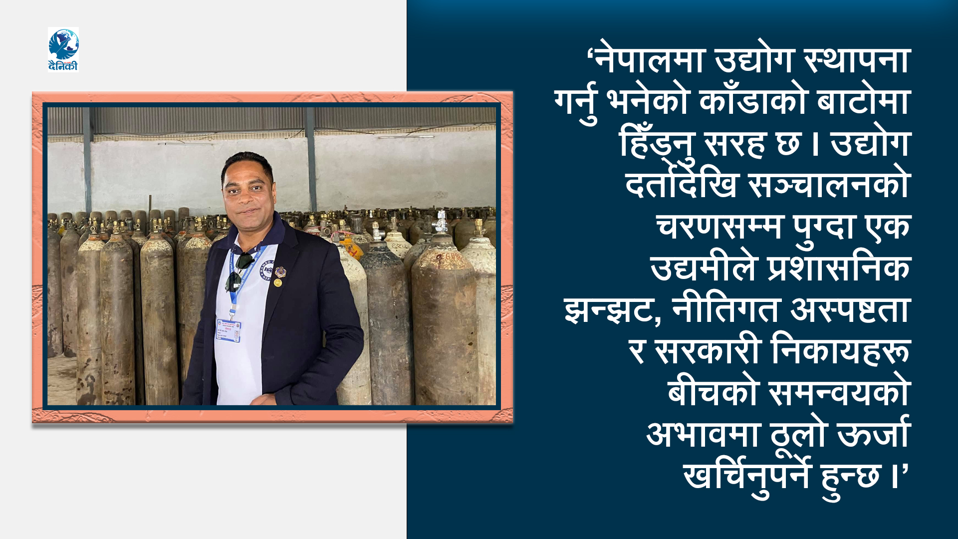 उहाँले भन्नुभयो, ‘कागजी प्रक्रियामा अल्झिएरै कयौँ सम्भावनाहरू अङ्कुराउन नपाई ओइलाउने गरेका छन् । हामीले अक्सिजन उत्पादन गरेर धेरैको जीवन बचायौँ, तर राज्यले उद्योगको ुजीवनु जोगाउन अझै धेरै काम गर्न बाँकी छ। जबसम्म नीतिगत लचकता आउँदैन र उद्योगमैत्री परिवेश बन्दैन, तबसम्म हामीले चाहेको सफल र समृद्ध नेपाल केवल कल्पनामा मात्र सीमित रहनेछ।’