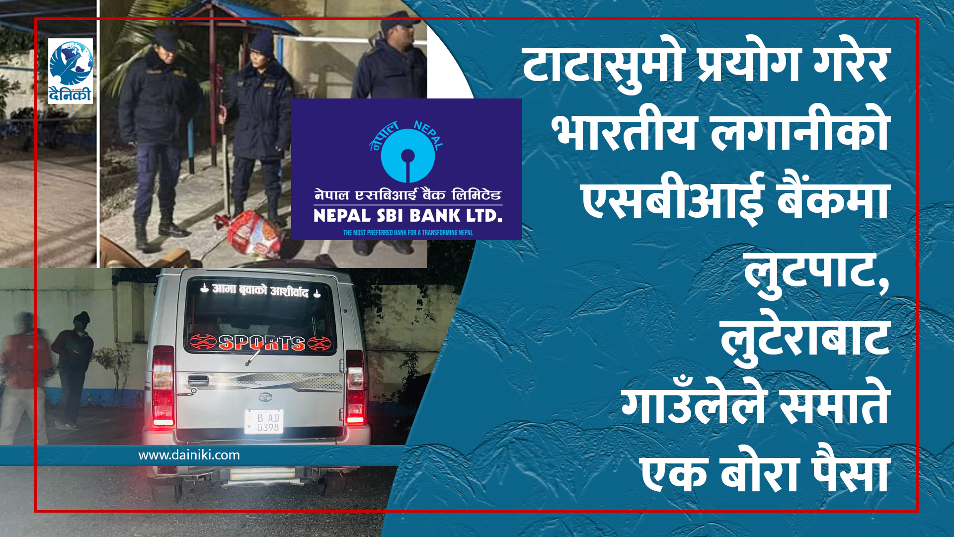 २९ पुस, काठमाडौँ । विवाहमा जाने भन्दै हिँडेका नकाबधारीले भारतीय लगानीको एसबीआई बैंक लुटेका छन । मंगलबार राति सिन्धुलीको घ्याङ्लेख गाउँपालिका–२ मा रहेको एसबीआई बैंकमा लुटपाट भएको छ । बिएडी ०३९८ नम्बरको टाटासमुको प्रयोग गरेर सात जनाको समूहले बैंक लुटेको हो ।