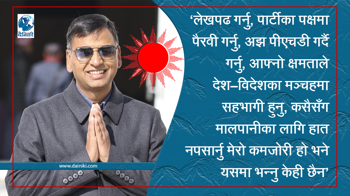 लेखपढ गर्नु, पार्टीका पक्षमा पैरवी गर्नु, अझ पीएचडी गर्दै गर्नु, आफ्नो क्षमताले देश–विदेशका मञ्चहमा सहभागी हुनु, कसैसँग मालपानीका लागि हात नपसार्नु मेरो कमजोरी हो भने यसमा भन्नु केही छैन । राजनीतिमा अगाडिबाट प्रतिस्पर्धा गर्न नसकेपछि व्यक्तिगत प्रतिष्ठामाथि आक्रमण गर्ने कायरहरुप्रति जति घृणा गरे पनि कमै हुन्छ ।