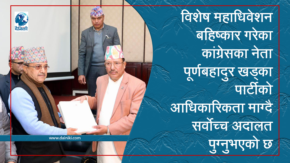 ४ माघ, काठमाडौँ । विशेष महाधिवेशन बहिष्कार गरेका नेपाली कांग्रेसका नेता पूर्णबहादुर खड्का पार्टीको आधिकारिकता माग्दै सर्वोच्च अदालत पुग्नुभएको छ । निर्वाचन आयोगलाई विपक्षी बनाएर रिट दर्ता गर्न खड्का सर्वोच्च पुग्नुभएको हो ।