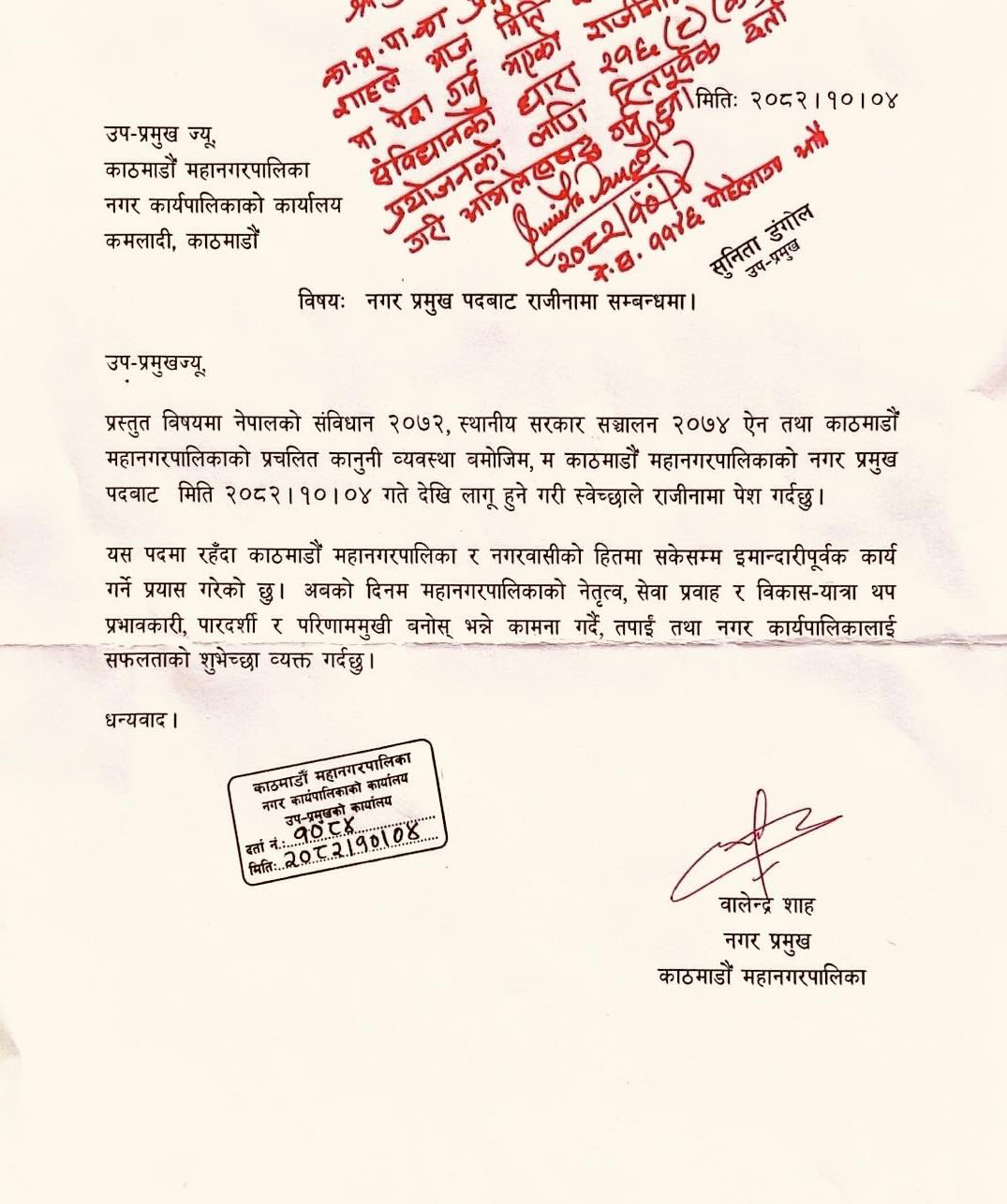 ४ माघ, कमठमाडाैँ । काठमाडौँ महानगरपालिकाका मेयर बालेन शाहले पदबाट राजीनामा दिनुभएकाे छ ।