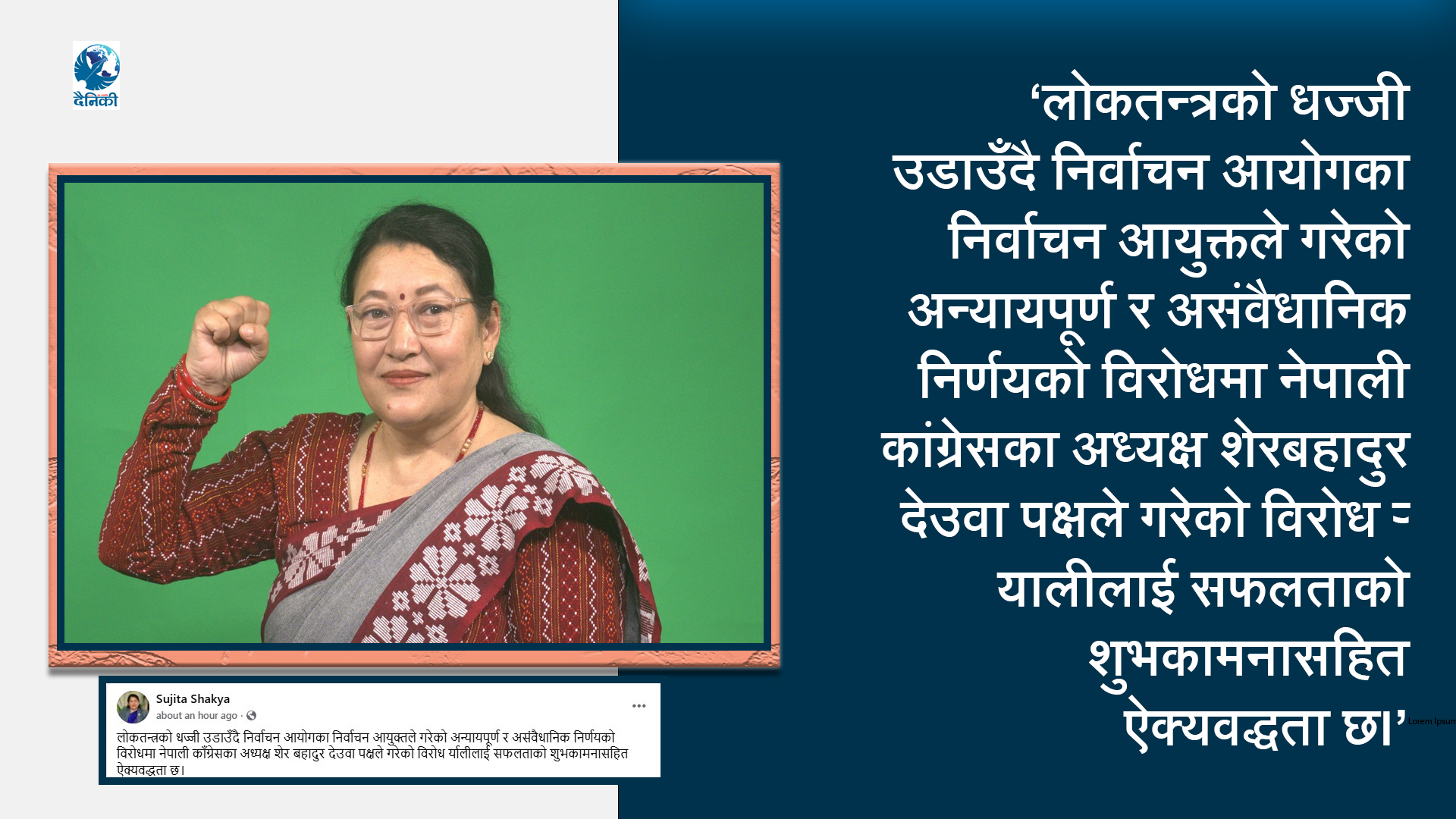 ४ माघ, काठमाडाैँ । नेकपा (एमाले)को नेता सुजिता शाक्यले गगन थापा नेतृत्वको कांग्रेस अस्वीकार गर्ने बताउनुभएको छ। महासचिव शंकर पोखरेल पत्नी समेत रहनुभएको उहाँले आइतबार शेरबहादुर देउवा पक्षले माइतीघरमा आयोजना गरेको विरोध कार्यक्रममा ऐक्यवद्धता जनाउँदै उनले देउवा नै कांग्रेसको आधिकारिक सभापति भएको दाबी गर्नुभएको छ ।