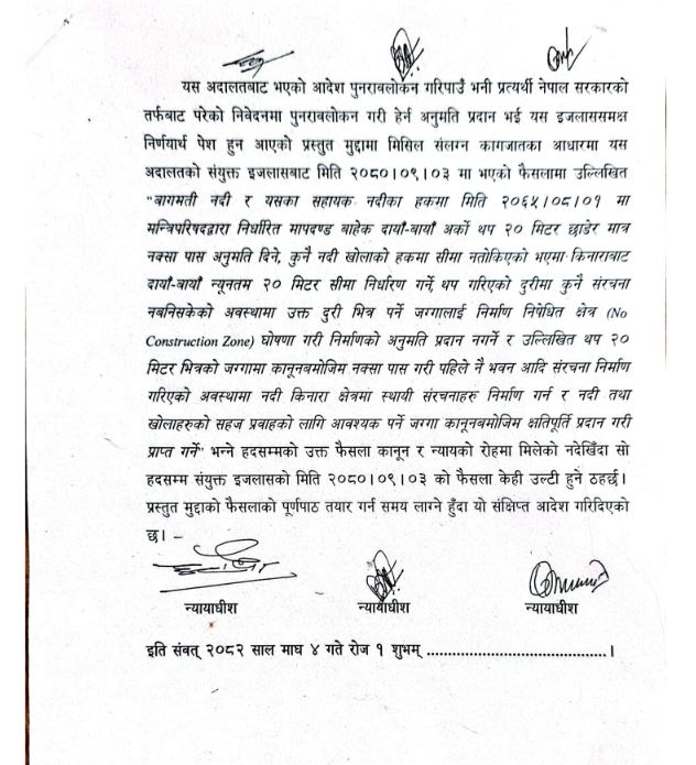 यसअघि २०८० पुस ३ गते सर्वोच्च अदालतको संयुक्त इजलासले नदी किनारमा सरकारले तोकेको न्यूनतम २० मिटरको सीमामा थप २० मिटर जोडेर निर्माण अनुमति दिनुपर्ने र सो क्षेत्रलाई ‘निर्माण निषेधित क्षेत्र’ घोषणा गर्न आदेश दिएको थियो। उक्त निर्णयपछि उपत्यकामा रहेका हजारौँ निजी घरजग्गा प्रभावित हुने अवस्था सिर्जना भएको थियो।