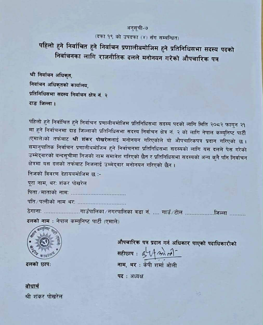 एमाले अध्यक्ष केपी शर्मा ओलीले दाङ क्षेत्र नम्बर २ बाट प्रतिनिधिसभा सदस्यका लागि पोखरेललाई उम्मेदवार बनाएको औपचारिक पत्र दिएका हुन्। यसअघि एमालेले दाङ–२ बाट महासचिव पोखरेलको नाम एकल सिफारिस गरेको थियो।