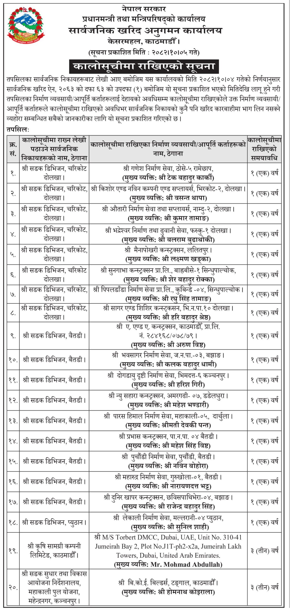 सार्वजनिक खरिद अनुगमन कार्यालयले २० वटा निर्माण व्यवसायी तथा आपूर्तिकर्तालाई कालोसूचीमा राखेको हो । प्रधानमन्त्री तथा मन्त्रिपरिषद्को कार्यालयअन्तर्गतको उक्त कार्यालयले विभिन्न सार्वजनिक निकायको सिफारिसका आधारमा सार्वजनिक खरिद ऐन, २०६३ को दफा ६३ बमोजिम उनीहरूलाई कालोसूचीमा राख्ने निर्णय गरेको हो।