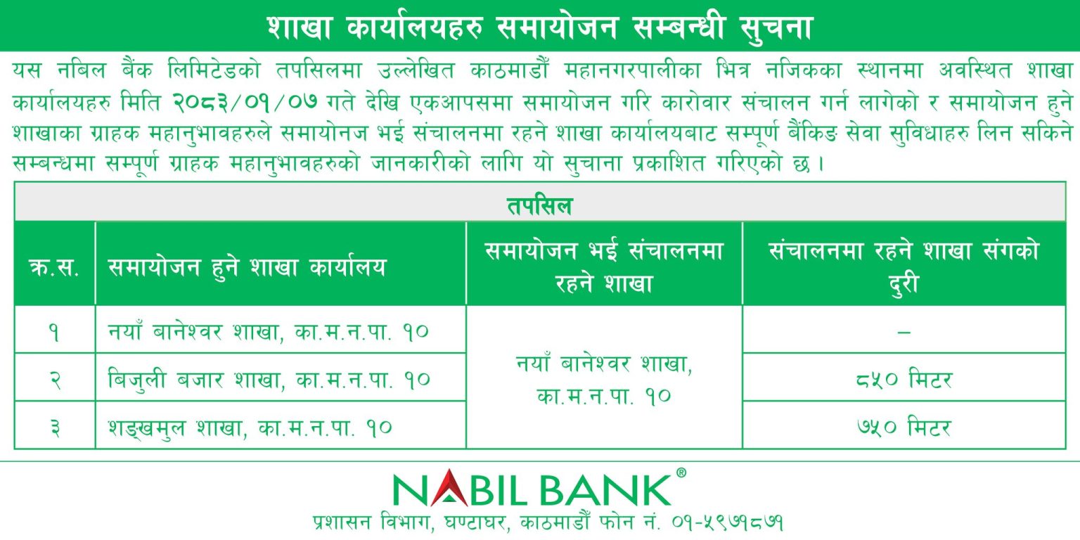 ७ माघ, काठमाडौं । नबिल बैंकको तीन शाखा कार्यालय समायोजन भएको छ । बैंकले एक सूचना जारी गर्दै तीन शाखा कार्यालय समायोजन गरी नयाँ बानेश्वरमा शाखा कार्यालय संचालन गरेको जनाएको छ ।