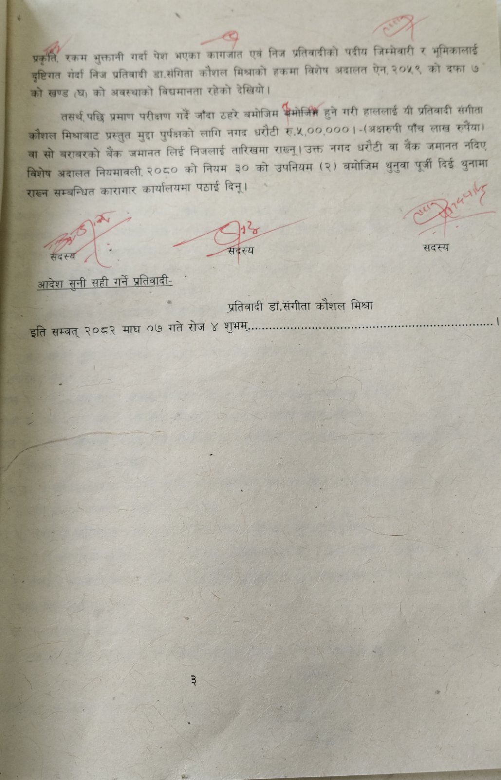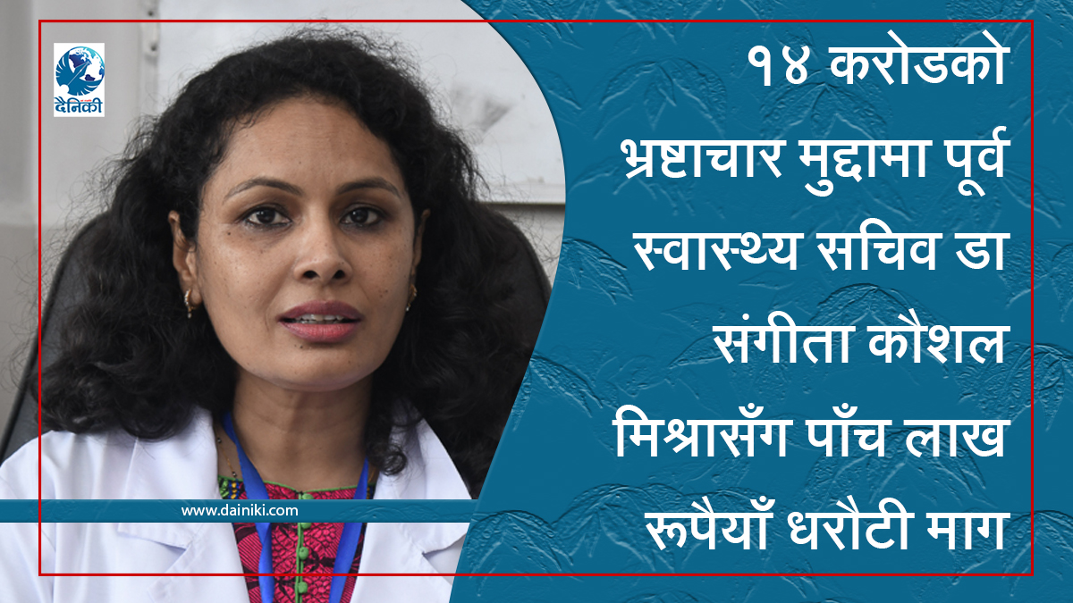७ माघ, काठमाडौँ । विशेष अदालतले पूर्व स्वास्थ्य सचिव डा संगीता कौशल मिश्रासँग पाँच लाख रूपैयाँ धरौटी माग गरेको छ । बुधबार मिश्रासहितको मुद्दाको सुनुवाइ गर्दै विशेषले पाँच लाख धरौटी माग गरेको हो ।
