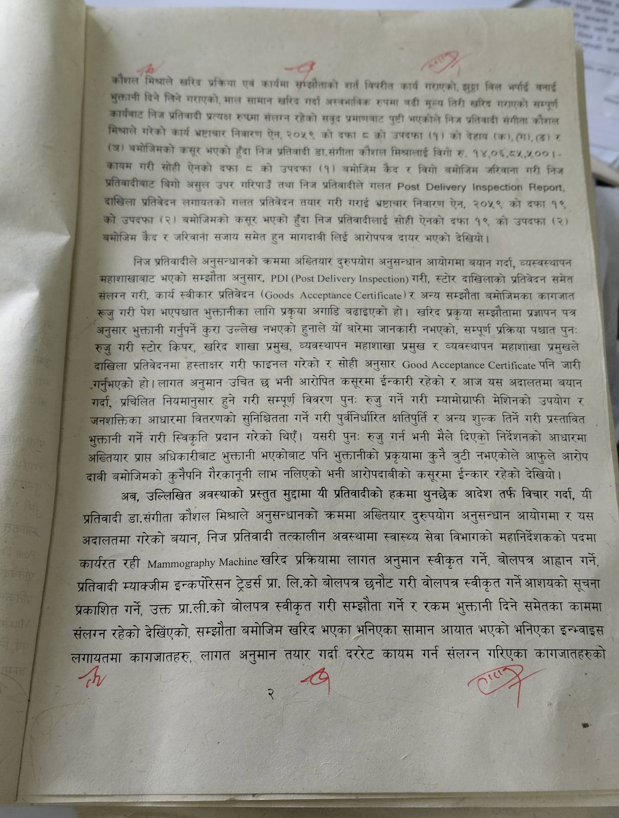 मिश्रासहित माथि थ्रीडी मेमोग्राफी मेसिन खरिदमा भ्रष्टाचार गरेको आरोप छ । स्वास्थ्य सेवा विभागको तत्कालीन महानिर्देशक मिश्रा, निर्देशक डा। श्रवण कुमार थापा, बरिष्ठ स्वास्थ्य प्रशासक डा। सुरेन्द्र प्रसाद चौरसिया, निर्देशक डा विवेक कुमाल लाल, प्रमुख लेखा नियन्त्रक भुवन प्रसाद काफ्ले, जनस्वास्थ्य अधिकृत दिपक अधिकारी, शाखा अधिकृत यादव प्रसाद सापकोटा, लेखा अधिकृत शम्भुप्रसाद ढकाल, कानून अधिकृत सीता घिमिरे, बायोमेडिकल इञ्जिनियर आशिष चौहान र पद्मा मिश्र तथा जनस्वास्थ्य निरीक्षक सञ्जय कुमार साह र लेखापाल तिलकराम ढकालविरुद्ध मुद्दा दायर भएको थियो ।