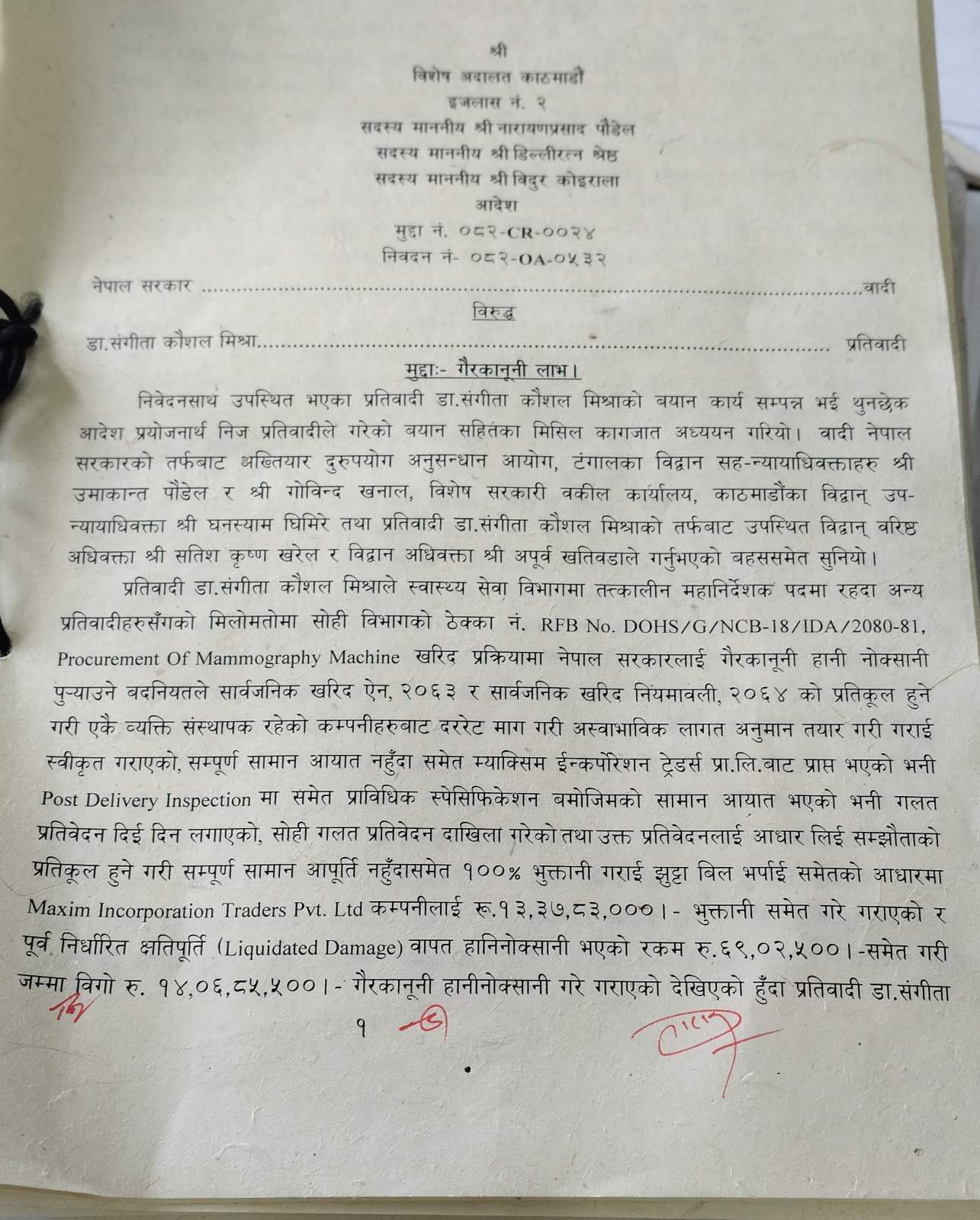 विशेषका न्यायाधीशहरू नारायण पौडेल, डिल्लीरत्न श्रेष्ठ र विदुर कोइरालाको इजलाशले संगीतासँगमात्र पाँच लाख रूपैयाँ धरौटी माग गर्ने आदेश गरेको हो । अख्तियार दुरुपयोग अनुसन्धान आयोगले कात्तिक २ गते मिश्रसहित १५ जनाविरुद्ध विशेष अदालतमा मुद्दा दर्ता गरेको थियो ।