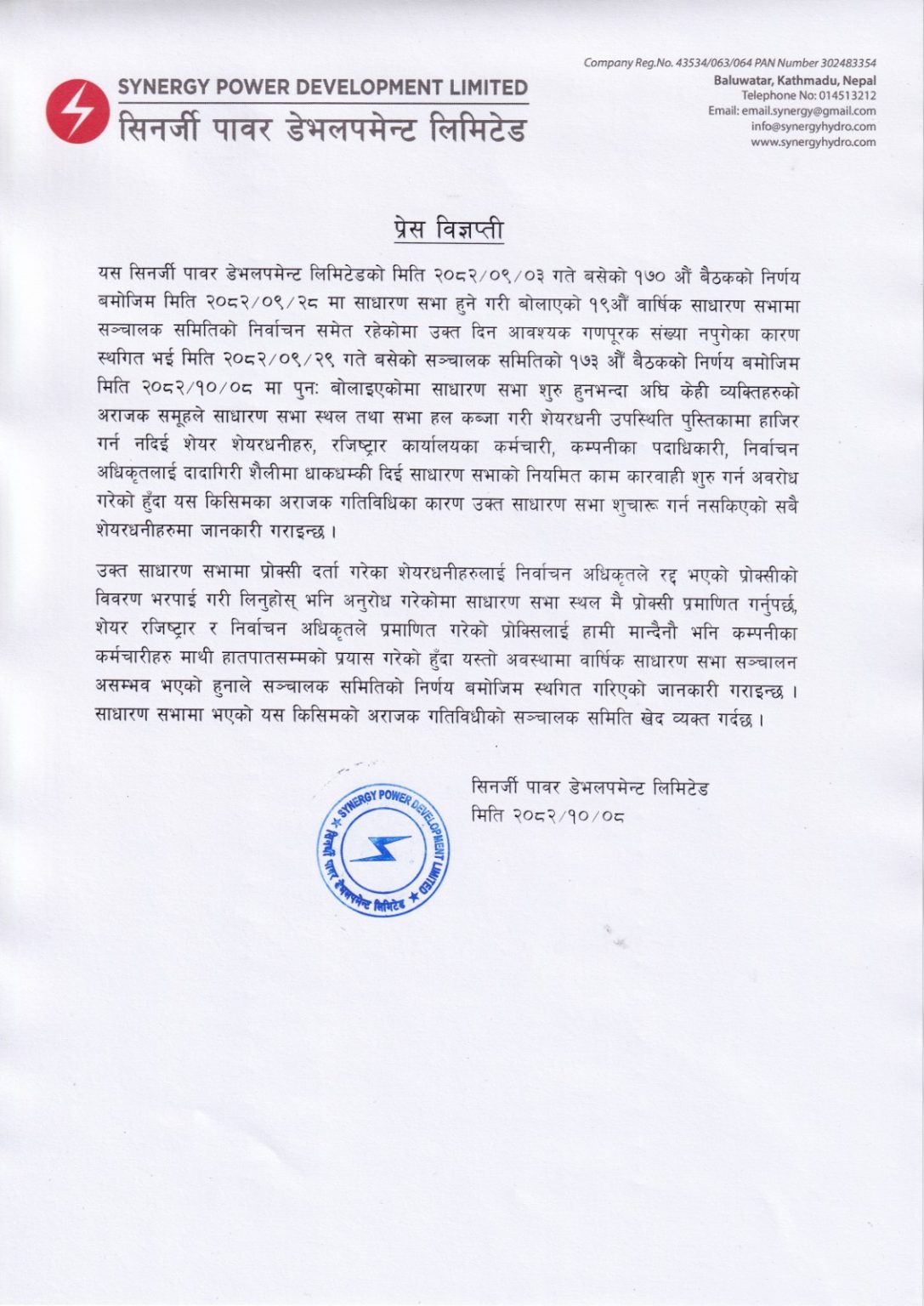 सिनर्जी पावरले भन्योः ‘अराजक समूहको दादागिरी र धाकधम्कीले गर्दा साधारणसभा गर्न सकिएन’