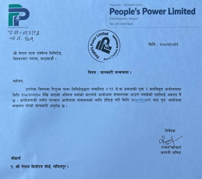 ११ माघ, काठमाडाैं । पिपुल्स पावर लिमिटेडले सञ्चालन गर्दै आएको ४.६ मेगावट क्षमताको पुवा २ जलविद्युत आयोजनाले पुनः विद्युत उत्पादन थालनी गरेको छ ।