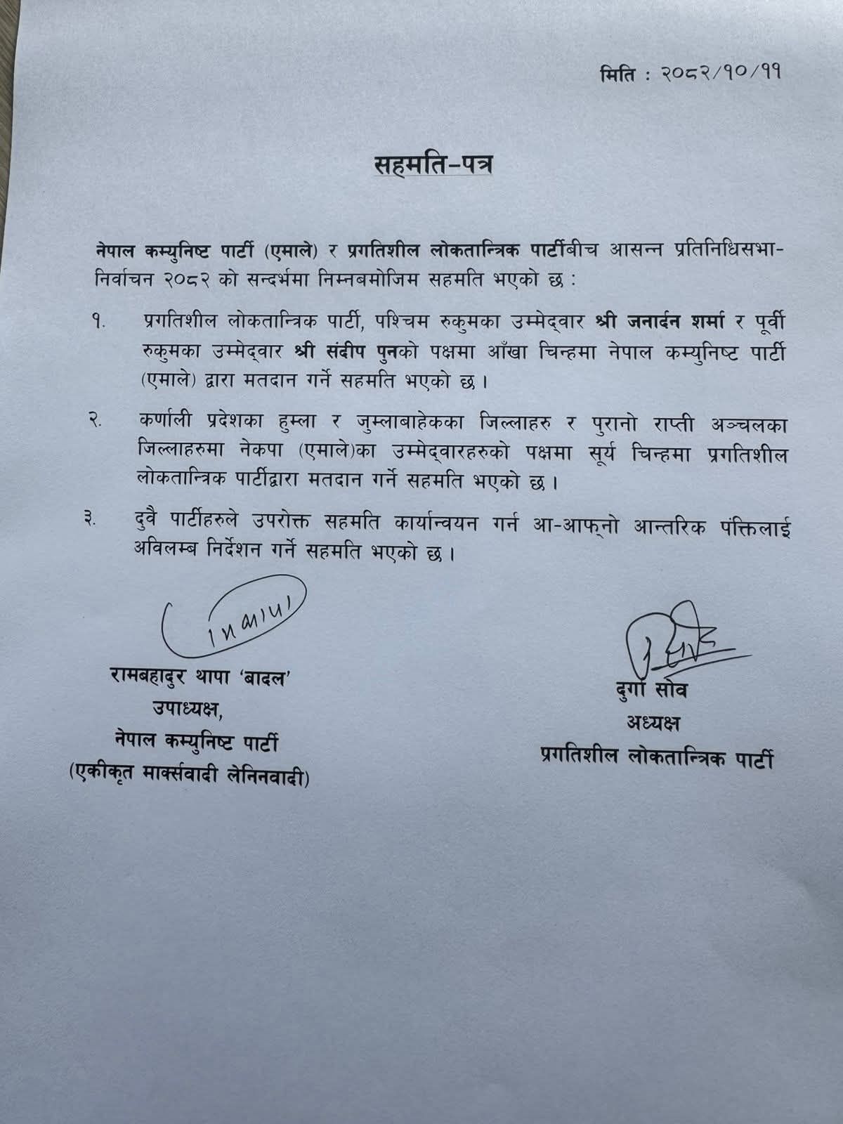 एमाले उपाध्यक्ष रामबहादुर थापा बादल र प्रलोपा अध्यक्ष दुर्गा सोवबीच आइतबार सहमतिपत्रमा हस्ताक्षर भएको हाे । सहमतिअनुसार रूकुम पश्चिममा जनार्दन शर्मा र रूकुम पूर्वमा सन्दीप पुनलाई एमालेले सहयोग गर्नेछ।