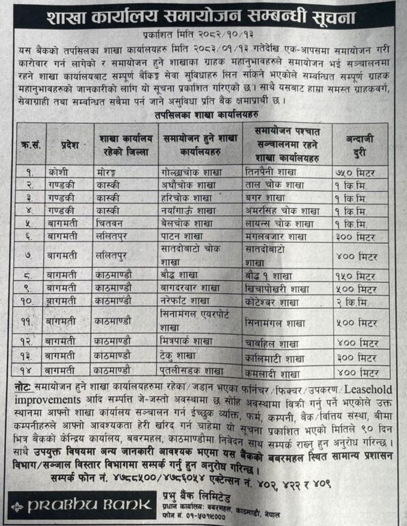 १५ माघ, काठमाडौँ। प्रभु बैंक लिमिटेडले उपत्यकासहित विभिन्न जिल्लाका १४ वटा शाखा बन्द भएका छन् । बैंकका अनुसार काठमाडौं उपत्यकाका ९ सहित मोरङ, कास्की र चितवनका शाखा समायोजन गरीएको हो ।