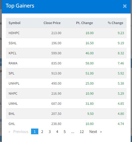 आज ३२० कम्पनीको ३ करोड ५४ लाख ७७ हजार कित्ता सेयर किनबेच हुँदा १४ अर्ब ५६ करोड ३१ लाख रुपैयाँको सेयर कारोबार भएको हो । यस दिन हिमाल दोलाखा हाइड्रोपावरको सेयर मूल्य ९.२३ प्रतिशत, शिवश्री हाइड्रोपावरको सेयर मूल्य ९.१९ प्रतिशत, कालिका पावरको सेयर मूल्य ८.३२ प्रतिशतले बढेको छ ।