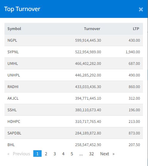 आज ३२० कम्पनीको ३ करोड ५४ लाख ७७ हजार कित्ता सेयर किनबेच हुँदा १४ अर्ब ५६ करोड ३१ लाख रुपैयाँको सेयर कारोबार भएको हो । यस दिन ङादी ग्रुप पावरको सेयर सर्वाधिक कारोबार भएको छ । आज कम्पनीको ५९ करोड ९९ लाख १४ हजार रुपैयाँ बराबरको कारोबार भएको छ । त्यस्तै, एसवाइ प्यानल नेपालको ५२ करोड २९ लाख ५४ हजार रुपैयाँ, यूनाइटेड मोदी हाइड्रोपावरको ४६ करोड ६४ लाख २ हजार रुपैयाँ, यूनियन हाइड्रोपावरको ४४ करोड ६२ लाख ८५ हजार रुपैयाँ र राधी विद्युत कम्पनीको ४३ करोड ३० लाख ३३ हजार रुपैयाँको कारोबार भएको हो ।