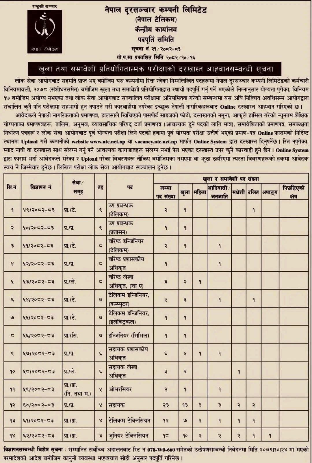 १६ माघ, काठमाडाैं । नेपाल टेलिकममा जागिर खुलेको छ। कम्पनीले खुला तथा समावेशी प्रतियोगितात्मक परीक्षाद्वारा पदपूर्ति गर्न लागेको हो।