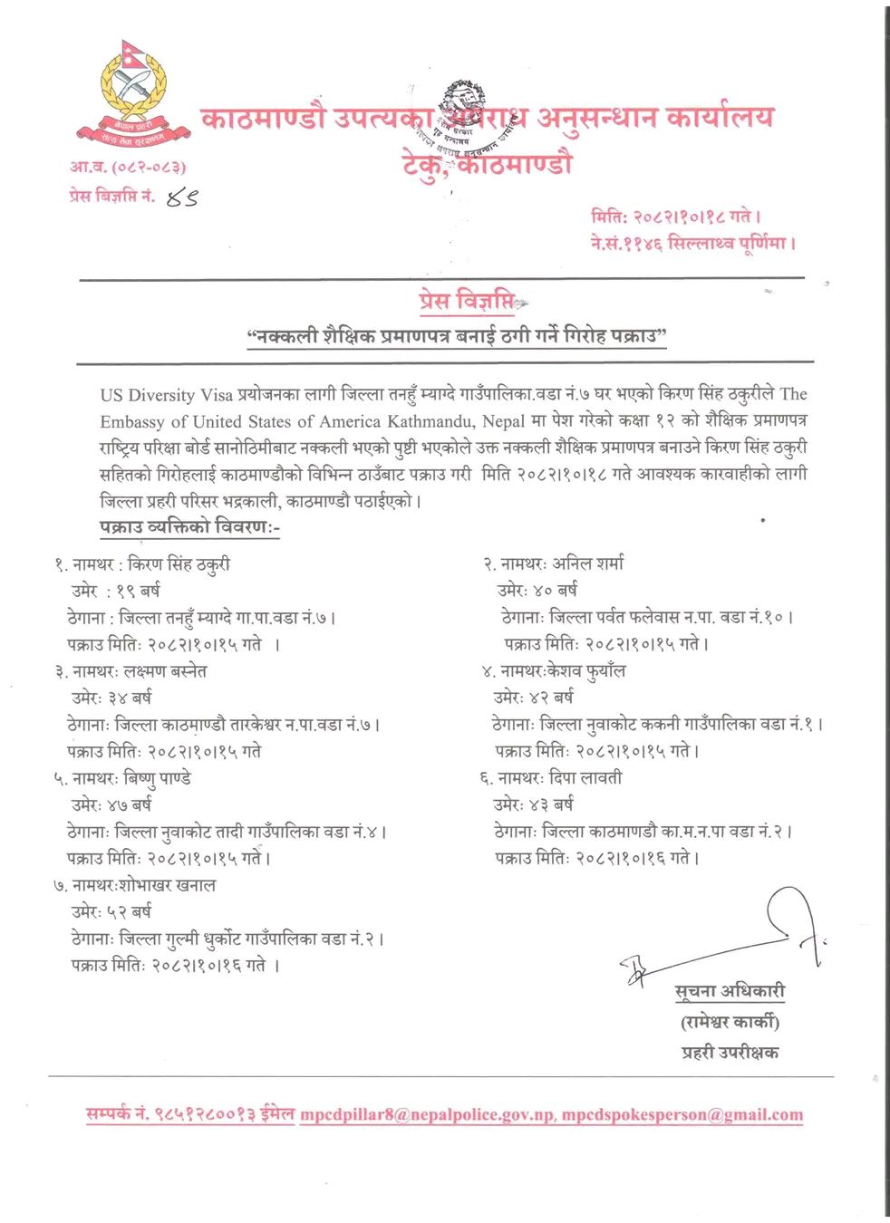 १८ माघ, काठमाडौँ । अमेरिका जान +2 को नक्कली प्रमाणपत्र बनाउने नुवाकोटका दुईसहित सात पक्राउ परेका छन । म्याग्दीको किरणसिंह ठकुरीको अमेरिका जाने प्रयोजनका लागि +2 को नक्कली प्रमाणपत्र बनाएको अभियोगमा प्रहरीको उपत्यका अपराध अनुसन्धान कार्यालयले सिंहसहित सात जनालाई पक्राउ गरेको एसपी रामेश्वर कार्कीले जानकारी दिनुभयो ।