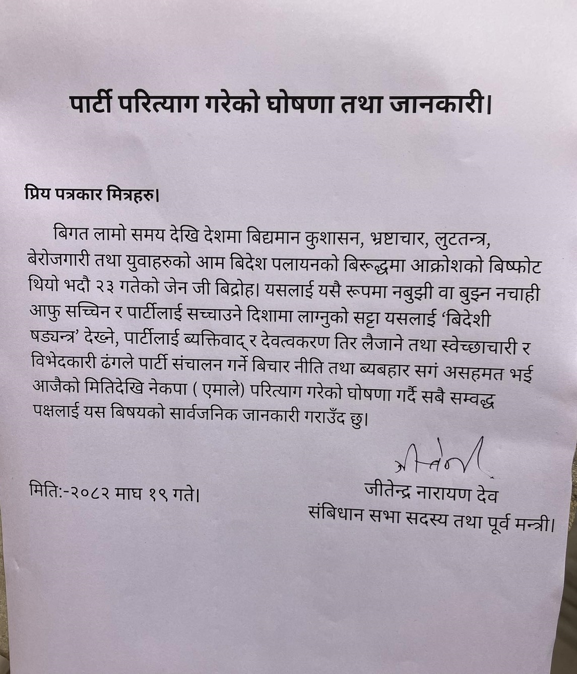 १९ माघ, काठमाडाैं । नेकपा एमालेका नेता जीतेन्द्र नारायण देवले पार्टी परित्यागको घोषणा गर्नुभएकाे छ । सोमबार सामाजिक सञ्जालमार्फत विज्ञप्ती जारी गर्दै उहाँले एमाले परित्याग गरेको उल्लेख गर्नुभएकाे हाे ।