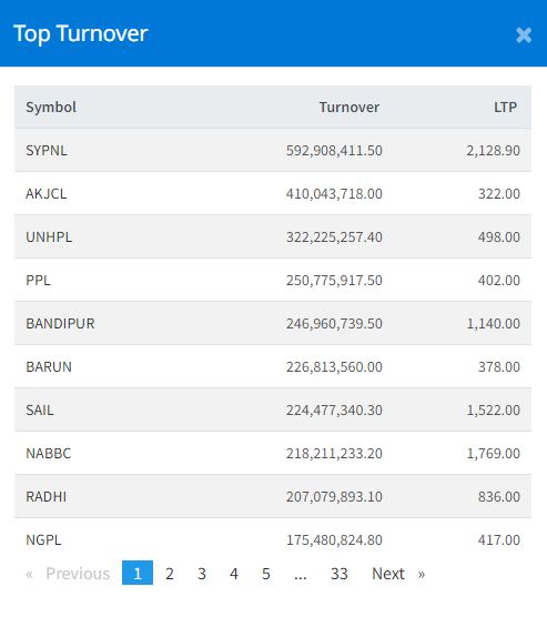 आज ३२२ कम्पनीको १ करोड ८७ लाख ३ हजार कित्ता सेयर किनबेच हुँदा ८ अर्ब ६३ करोड १५ लाख रुपैयाँको कारोबार भएको हो । आज एसवाई प्यानलको सर्वाधिक कारोबार भएको छ । कम्पनीको यस दिन ५९ करोड २९ लाख रुपैयाँ बढीको कारोबार भएको हो । साथै, आँखुखोला जलविद्युत कम्पनीको ४१ करोड रुपैयाँ, युनियन हाइड्रोपावरको ३२ करोड २२ लाख रुपैयाँ, पिपल्स पावरको २५ करोड ७ लाख रुपैयाँको सेयर खरिद बिक्री भएको छ ।