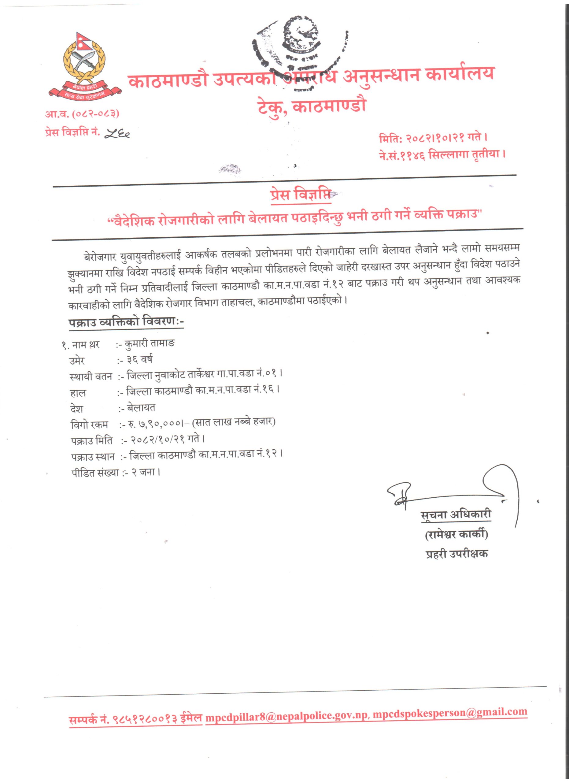 उहाँले भन्नुभयो, “निज तामाङले बेलायत पठाउने भन्दै रु सात लाख ९० हजार रकम लिइ लामो समयसम्म झुक्यानमा राखी विदेश नपठाई सम्पर्कविहीन भएको भन्ने पीडितको उजुरीका आधारमा पक्राउ गरिएको हो ।”