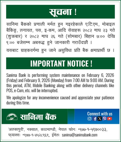 २२ माघ, काठमाडौँ । सानिमा बैंकको बैंकिङ्ग सेवा अवरुद्ध हुने भएको छ । बैंकले एक सूचना जारी गर्दै बैंकको प्रणाली मर्मत हुन गइरहेको हुँदा एटिएम, मोबाइल बैंकिङ्गलगायत पस, इ–कम सेवा अवरुद्ध हुने जनाएको हो ।