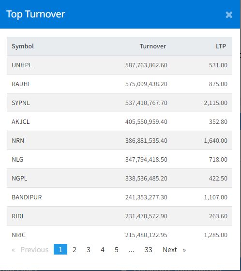 आज ३२६ कम्पनीको ३ करोड ५५ लाख ७४ हजार कित्ता शेयर किनबेच हुँदा ११ अर्ब ५८ करोड २८ लाख ९३ हजार रुपैयाँको कारोबार भएको हो । आज युनियन हाइड्रोपारको सर्वाधिक सेयर कारोबार भएको छ । यस दिन कम्पनीकाे ५८ करोड ७७ लाख रुपैयाँकाे काराेबार भएकाे हाे ।