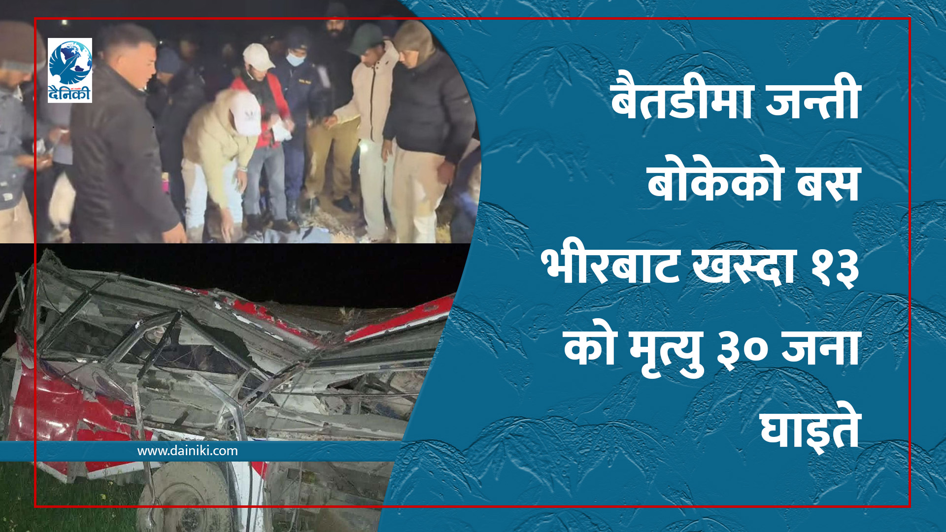 २३ माघ, काठमाडौँ । बैतडीमा मध्यराति जन्ती बोकेको बस दुर्घटना हुँदा १३ जनाको मृत्यु भएको छ । दुर्घटनामा ३० जना घाइते भएका छन । बझाङबाट पत्रकार सत्यराज सिंहले दिएको जानकारी अनुसार बैतडीको पुर्चौडी नगरपालिका वडा–७ को भौनीबाट बेहुली लिएर बझाङको सुनकुडातर्फ फर्किंदै गरेको बस पुर्चौडी-७ कै बडगाउँ घुम्तीमा दुर्घटनामा परेको हो ।