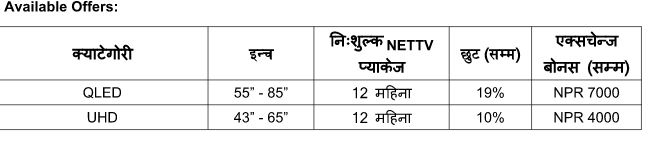 यसका साथै, मनोरन्जनको अनुभवलाई अझ राम्रो बनाउन, सामसङले २०२१ देखि २०२५ सम्म उत्पादन भएका टिभीको खरिद गर्दा आफ्ना ग्राहकहरूलाई ३००० सम्मको नि:शुल्क नेट टीभी प्याकेज पनि प्रदान गर्दैछ। QLED र UHD मोडेल किन्दा १२ महिनाको निःशुल्क नेट टीभी सब्स्क्रिप्सन पाइन्छ भने FHD र HD मोडेल किन्दा ६ महिनाको निःशुल्क नेट टीभी सब्स्क्रिप्सन पाइन्छ।