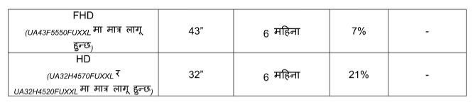 ग्राहकलाई थप आश्वासन प्रदान गर्नका लागि, सामसङले आफ्ना T, A, B, C, D, र F Series TVहरूमा उत्पादनसम्बन्धी त्रुटि कभर हुने ३ वर्षको व्यापक वारेन्टी पनि प्रदान गर्दछ।