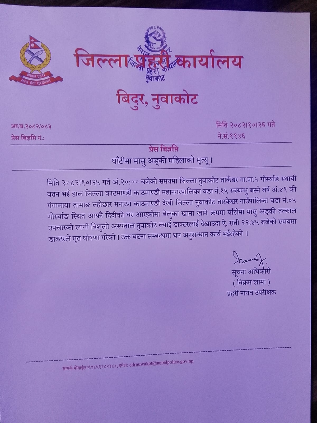 २८ माघ, नुवाकोट । घाँटीमा मासु अड्किँदा एक महिलाको मृत्यु भएको छ । जिल्ला प्रहरी कार्यालय नुवाकोटका अनुसार तारकेश्वर गाउँपालिका–५ गोरख्याङ स्थायी घर भई हाल काठमाडौं महानगरपालिका–१५ स्वयम्भू बस्दै आएकी वर्ष ४९ की गंगामाया तामाङको मृत्यु भएको हो डिएसपी विक्रम लामाले पुष्टि गर्नुभएको छ ।